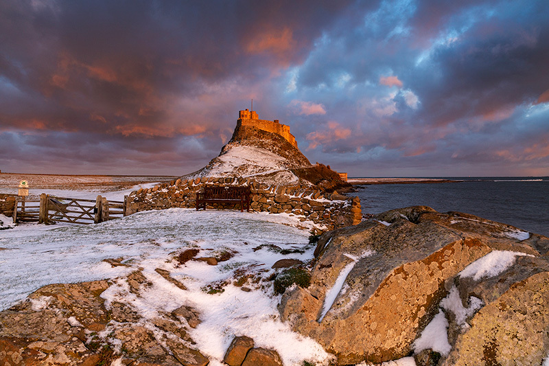Celtic Crafts, a beautiful shop on Holy Island with an atmosphere to match, recently agreed to stock my work, so it’s been a great excuse to spend time on the Island for new photographs. Firstly, a rare occasion, to get so much snow on the Island, especially with such beautiful light and colour over and above the Castle.